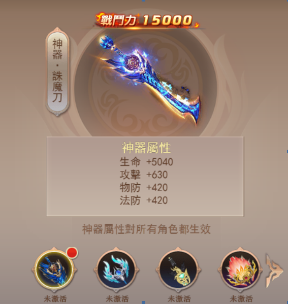 目前遊戲內增加戰力的途徑非常多,但最早接觸的其中之一肯定就是神器系統了,新手連續登錄遊戲第二天就可以領到神器·誅魔刀,在新手期幫助非常大,另外連續登錄7天還有神器·諦魂弓,記得要及時領取,神器系統也是在歷練里,點擊神器就可以去激活領取到的神器了。神器系統里分為神器界面,靈石鑲嵌和靈石合成。