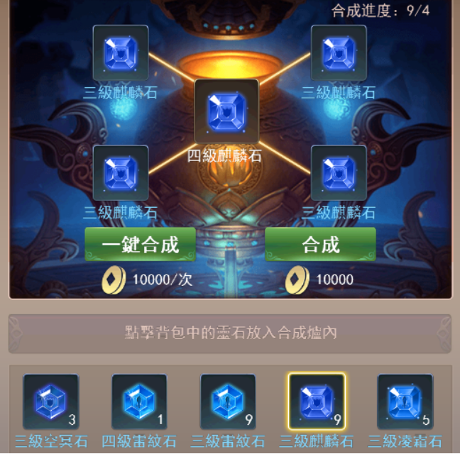 靈石合成就不用多說了,4個靈石可以合成一個高一級的靈石,屬性几乎翻倍,不過前期靈石獲取不多的話,建議先優先全部靈石位都鑲嵌滿后再逐一進行升級,這樣可以最大化戰力提升。