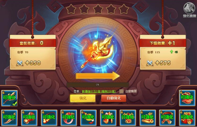 裝備可以通過強化、寶石鑲嵌、屬性轉移等途徑,為角色附加戰鬥屬性,單件裝備最高可強化至15級,裝備分為5種品質(綠、藍、紫、金、橙),品質越高的裝備,屬性也更為優秀。