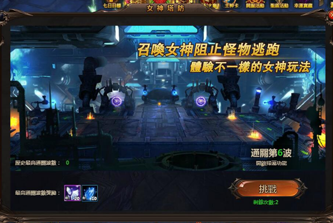 傳統的塔防玩法:玩家在自己所在位置召喚女神,女神有攻擊範圍,會自動攻擊敵人,有10波怪物,每一波怪物從起點往終點跑。怪物不會攻擊,只會按照地圖路線跑,每有一個怪物到終點算逃跑成功,副本剩餘生命-1。副本剩餘生命=0,或者10波怪全死了,副本結束。