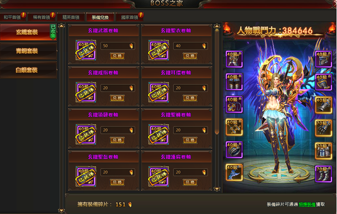b)通過熔煉多餘的裝備或擊殺和平BOSS獲取裝備碎片,使用裝備碎片兌換各個等級的裝備卷軸。