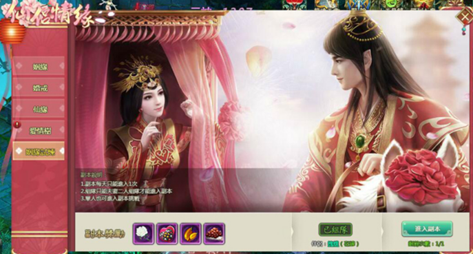 玩家結婚後就能啟動姻緣試煉副本啦。婚後玩家每天可以進入1次姻緣試煉副本,可以選擇夫妻組隊進入或者單人進入,夫妻組隊進入會有額外獎勵,在限定時間內,殺死副本內的所有怪物,即為通關。