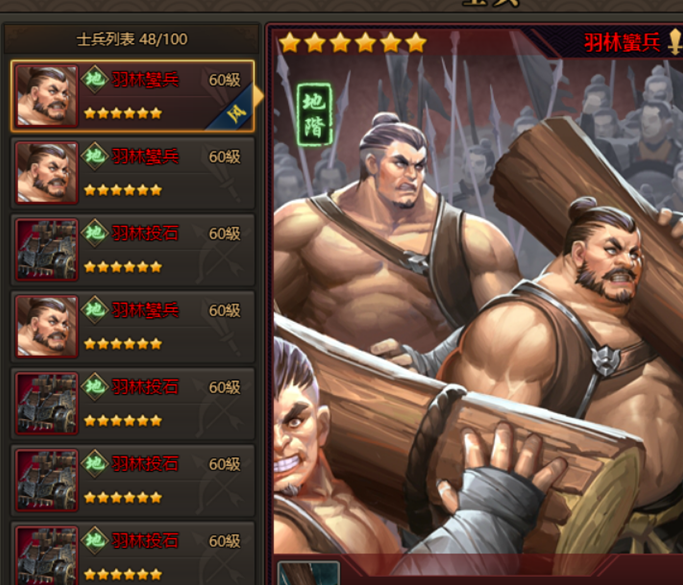 士兵:主公擁有的士兵都在這裏,已上陣的士兵在前,按戰力從高到低排列,左邊可以查看士兵的資質、職業與基本屬性,使用突飛令升級士兵.例如下圖的羽林投石,資質為神話,職業為遠程群體。