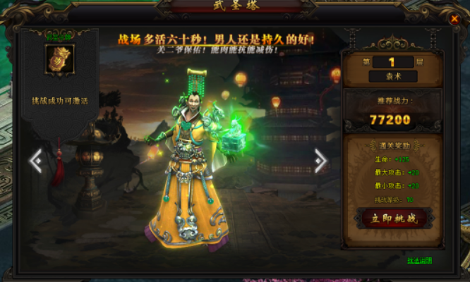 武聖塔共有120層,每層只能成功挑戰1次,挑戰失敗後可多次進入挑戰.,通關第一層可以獲得武聖令牌,之後每成功通關一層,武聖令牌就會升1級,通關第五層可以激活武聖令牌的特殊技能,之後每成功成功通關五層,特殊技能都會升1級。