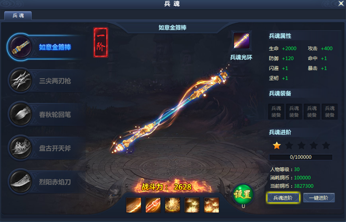1、兵魂共有5種,包括盤古開天斧、春秋輪回筆、烈陽赤焰刀、三尖兩刃槍和如意金箍棒。