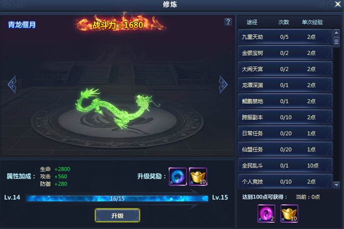 遊戲中玩家可以通過完成日成的任務中來獲得相對應的活躍度經驗值,經驗值滿了之後將可以直接升級仙劍,亦可獲得相對應的屬性加成讓角色能力更強大。