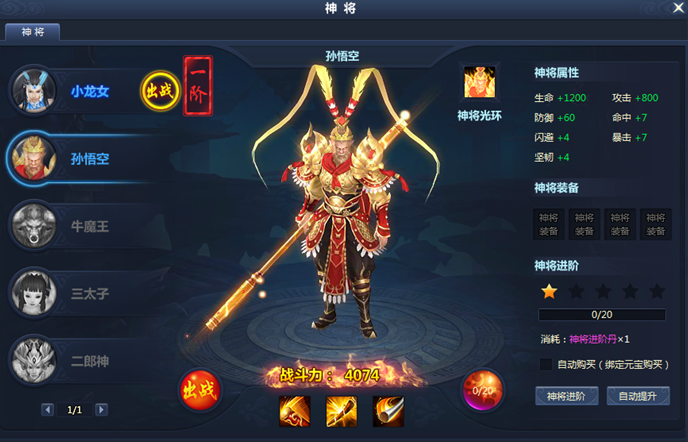 1、神將共有5個,分別為二郎神、三太子、牛魔王、孫悟空和小龍女,通過特定的精魄丹進行啟動。
