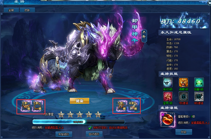 坐騎技能隨著坐騎的升階而被啟動和升級,玩家可通過消耗道具提升坐騎等級,等級越高,除了獲得更高的基礎屬性加成之外,對目標造成的技能傷害越大。