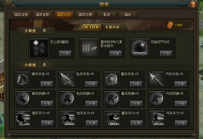 國家科技裏有戰鬥科技以及發展科技。戰鬥科技影響玩家的戰鬥屬性。發展科技影響玩家的收益。消耗玩家的個人威望就可以升級科技,達到提升自己實力的效果。