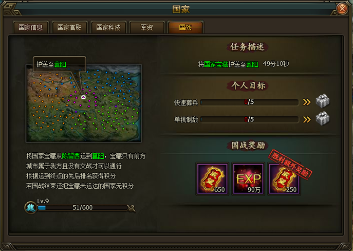 國家寶藏,協力前行,開啟條件:作為一種新增的國戰玩法,在每天的10:00、15:00、20:00三場國戰期間,會有一定的概率刷出國家寶藏玩法。這是一種以護送形式的,需要本國全體成員協力參與的全新國戰玩法。國戰開始後,每個國家會有一個寶藏車;玩家需要合力把寶藏車運輸到襄陽。