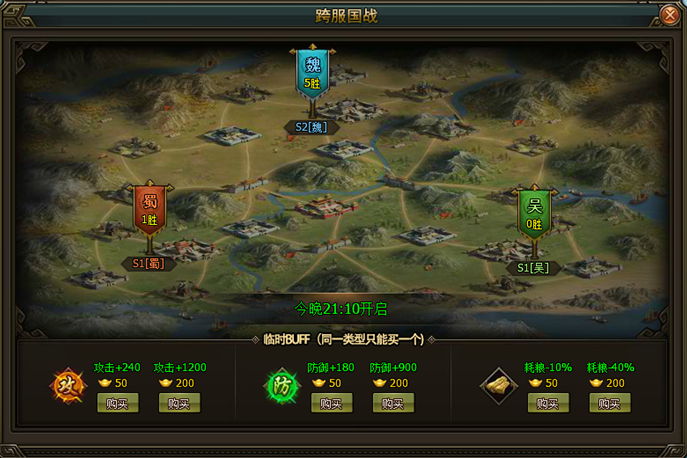 進入戰場前,可以購買一些強力的BUFF,BUFF僅在本次跨服國戰中生效。這是攻陷敵城的一大殺器噢!
