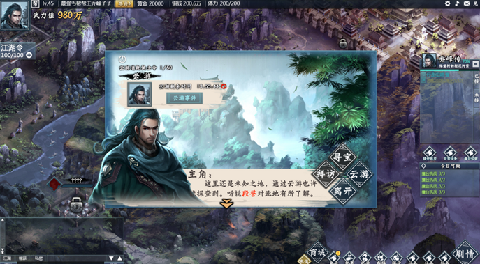 在主城解鎖後,玩家可以派遣俠士在主城區域進行雲遊,雲遊需要花費一定時間,每個主城區域同時只能有一個俠士進行雲遊, 雲遊過程隨機事件,雲遊有概率發現次級城鎮或者資源點,有些特殊城鎮或資源點需要指定俠士雲遊時才會解鎖,雲遊事件可以在觸發之後任意時間進行處理, 處理完之後,才會得到獎勵,處理完事件後,才可以再開始新的雲遊,雲遊需要消耗俠士令,雲遊俠士疲勞度不能高於一定值。