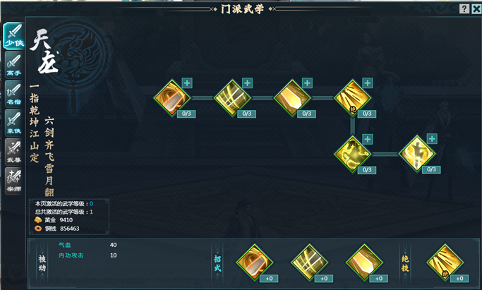 玩家達到指定等級後,武學開啟,玩家可以通過主介面的【武學】按鈕打開武學介面。