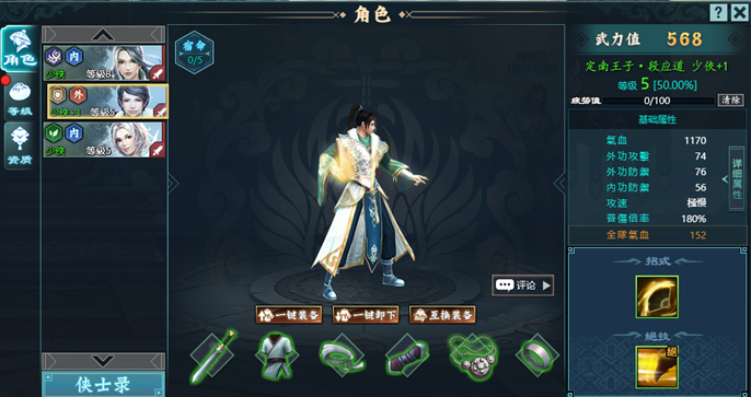 每個俠士根據職業不同有不同的屬性偏向,基礎屬性包括(氣血、內攻、外攻、內防、外防、攻速、身法、靈巧、筋骨、氣勁),每個俠士都可以通過戰鬥提升自身等級,每個俠士都有各自的招式、心法、絕技。
