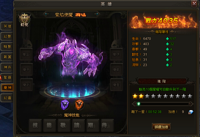 在魔神進階面板中,達到進階時間,可進階到下一階,另外也可以使用加速節省時間。魔神達到2階後可變換形態,成為你的好幫手,魔神階數越高,其變換的形態越拉風。