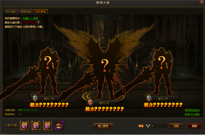 進入條件:軍團排名前四、47級以上玩家可參加戰場