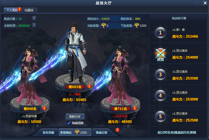 個人競技介面上會隨機刷新3個不同排名的角色讓玩家挑戰,每天玩家都有10次挑戰的機會,挑戰可獲得榮譽獎勵。每天根據自己的排名,玩家可在排名獎勵中領取到每日的榮譽獎勵。另外介面右邊會有個人競技前五的排名展示,進入前100名的玩家可以選擇挑戰前五名。