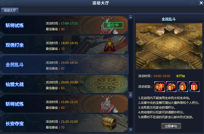 1、大亂鬥圖示會在活動時間前5分鐘倒計時出現遊戲介面,玩家可點擊圖示通過活動大廳介面進入戰場(等級50級可進入)。