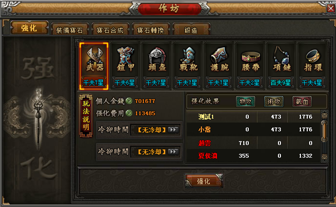 玩家獲得高等級的裝備卷軸和材料後,可以在作坊通過裝備鍛造功能鍛造出高等級裝備,如果材料不夠,還可以選擇花費元寶進行一鍵鍛造。