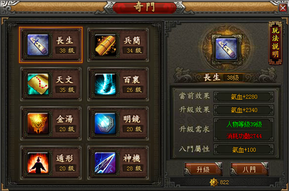當人物等級達到9級時,便可以通過主介面的奇門圖示進入奇門介面,提升奇門等級。奇門共有8個,對應不同的戰鬥屬性,玩家可以根據自身角色的特性進行選擇升級。