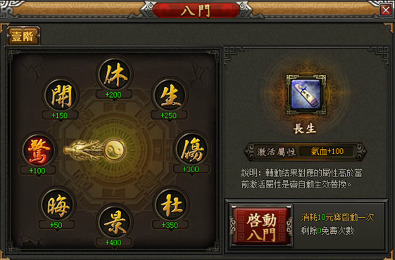 奇門升級到20、40、60、80、100級時,可以開啟八門,玩家可以免費啟動一次八門,隨機獲得八門的屬性。