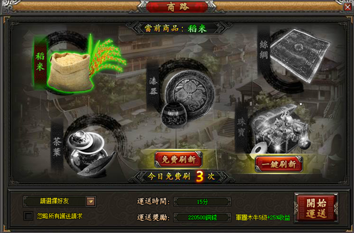等級達到27級時,可以從主介面的圖示入口進入商路介面和玩法,通過運送商品可以獲得銅錢獎勵。運送商品分5個品質,運送商品的品質越高獎勵越高。在運送開始之前可以通過採購功能提升商品品質,而花費元寶點擊一鍵採購就可以將你的商品品質提為最高級。