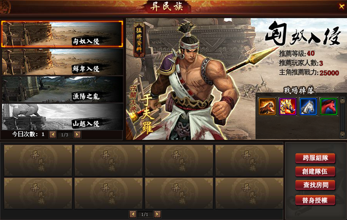 遊戲角色達到26級後,可以組隊進入異民族副本。點擊主介面上方的“異民族”圖示,就能進入異民族的介面。異民族開放了4個副本,分別是漁陽之亂、鮮卑入侵、匈奴入侵和山越入侵。玩家等級達到26級就能進入漁陽之亂,副本限制人數2人,只有守關沒有攻關;玩家等級達到40級就能進入匈奴入侵,副本限制人數3人,守關完成就會轉入攻關。