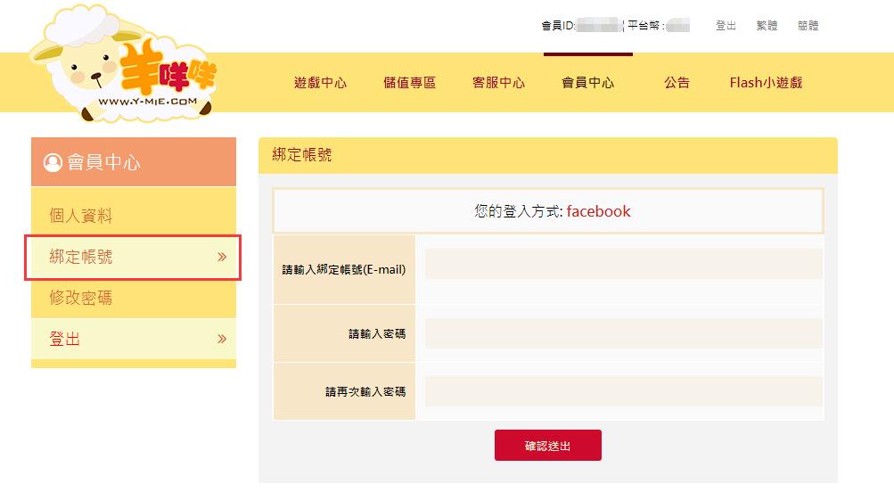 3.點選會員中心左側的綁定帳號欄位並輸入想要綁定的帳號與密碼