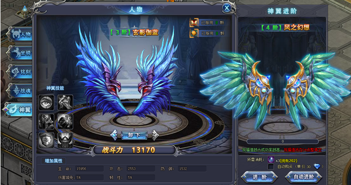3、 神翼技能可提升等級,需要消耗道具“神翼魂靈“
