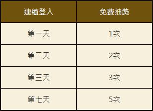 2、最高連續登入七日以上,將持續維持5次抽獎數。