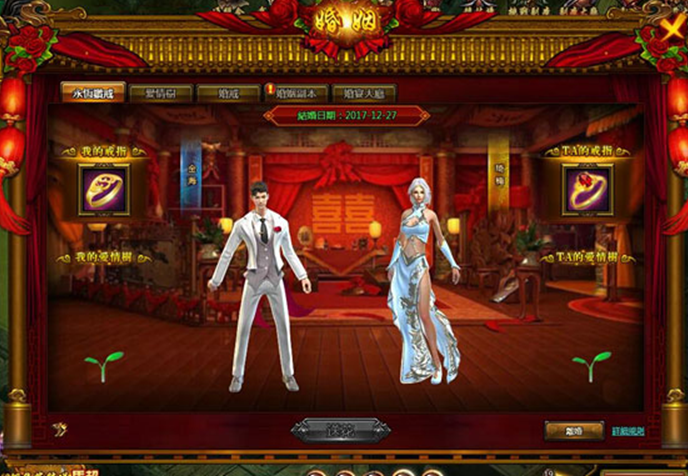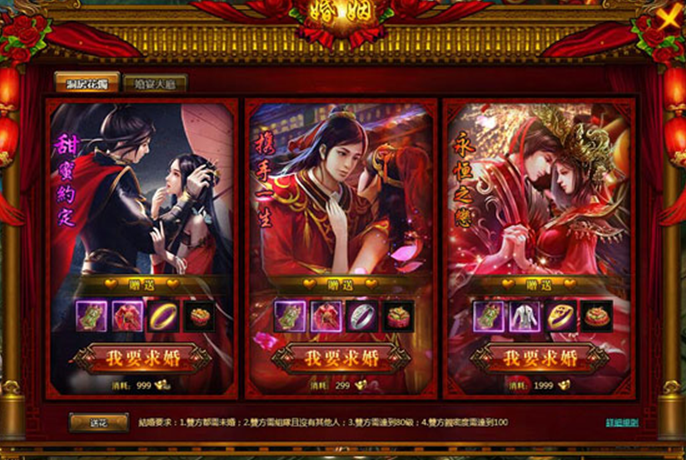 在遊戲內,雙方等級均到達 80 級並組好隊的單身男女玩家滿足了結為夫妻的要求和條件,即可隨時在遊戲中浪漫的場景結婚。正所謂百年修得同船渡,千年修得共枕眠,在遊戲中,首先玩家需要提高友好度才能求婚,通過花費元寶或者綁定元寶,選擇不同檔位的婚禮,即可正式開始求婚操作了。完成求婚後對方便將收到求婚提示的資訊,在限時內做出決定,如果對方選擇了我願意,那麼便將正式開啟屬於你們的婚禮了!