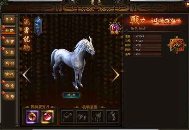 流雲龍駒渾身雪白,形象俊朗,雖為馬形,卻保留著龍的犄角,不僅能夠給玩家角色帶來移動速度的加成,更可以提供額外的戰鬥力。開啟坐騎系統,收服龍駒,在《群魔亂舞》中就是這般簡單!