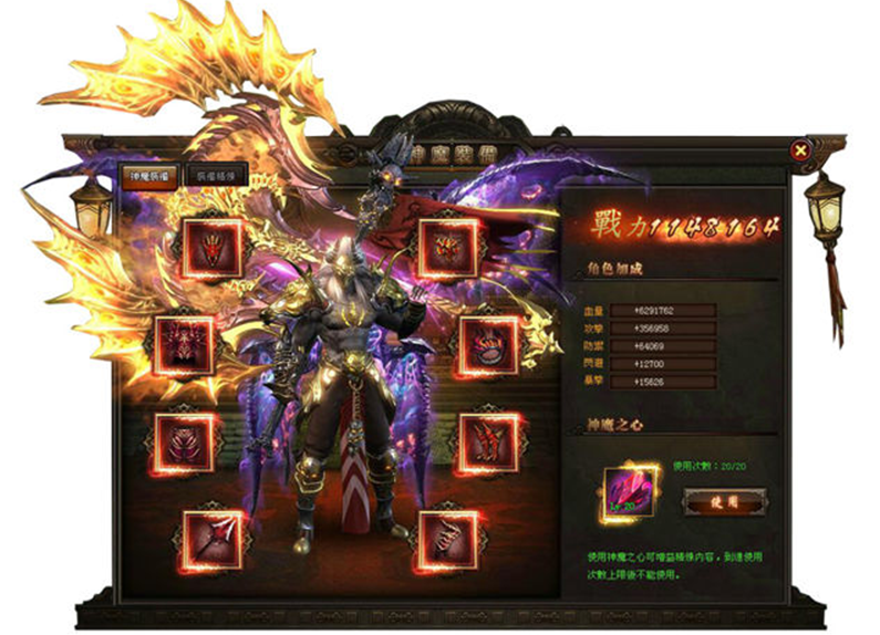 玩家穿上神魔套裝後就可以使用精煉石對裝備進行精煉,配合神魔之心,可大幅度增加裝備的屬性,提升玩家的戰鬥力。(神魔套裝可通過每日儲值和裝備寶庫獲得)。
