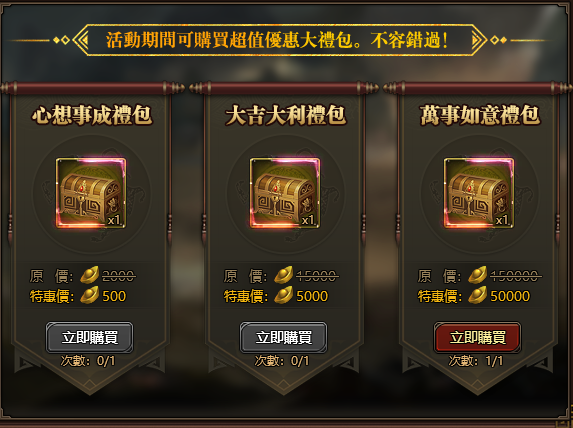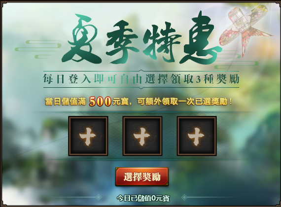每日登入即可自由選擇領取3種獎勵,當日儲值滿500元寶,可額外領取一次已選獎勵。