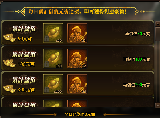 每日累計儲值達標,即可領取對應好禮~