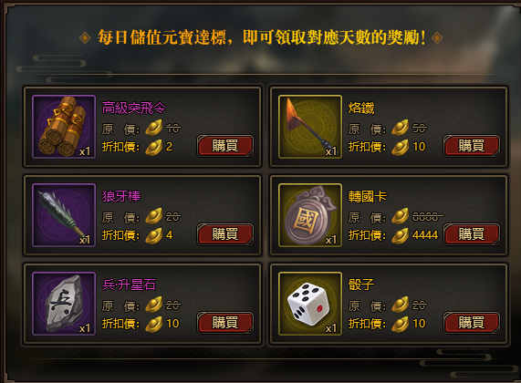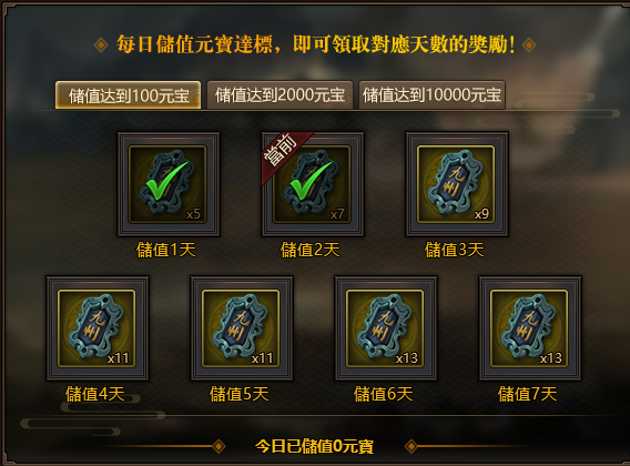 每日儲值金額達標,即可領取對應天數的獎勵