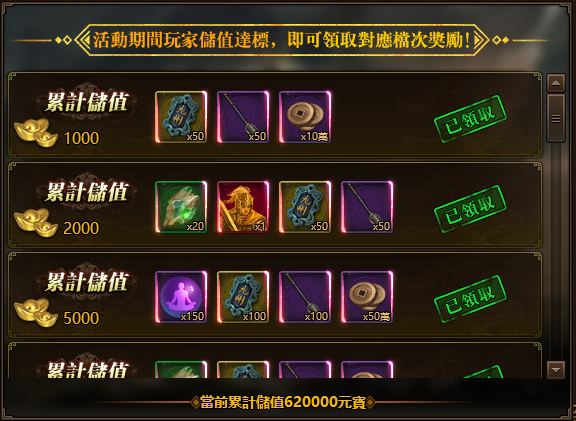 活動期間玩家儲值達標,即可領取對應檔次獎勵!