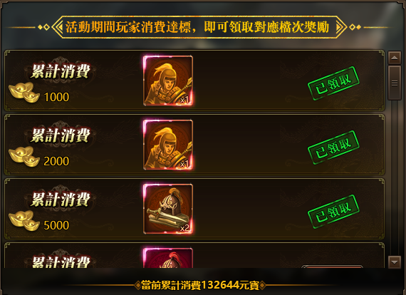 活動期間玩家消費達標,即可領取對應檔次獎勵!