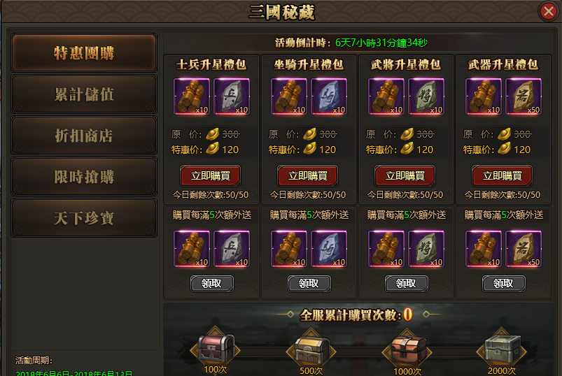 精選禮包4折,每日有50次的次數限制,每日購買每滿5次免費贈送一份對應禮包。全服累計購買次數達到一定數量更有超值寶箱贈送。