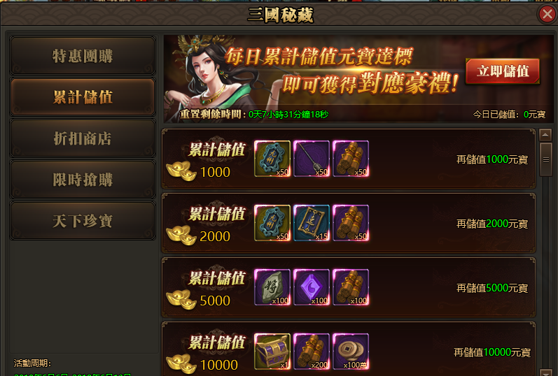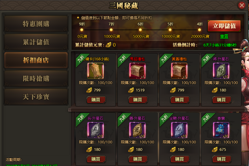 折扣商店限時開啟,七天內累計儲值到一定金額,即可以該金額所對應的折扣購買精選商品,最低4折!每種商品活動期間限購100次,可用元寶刷新購買次數。