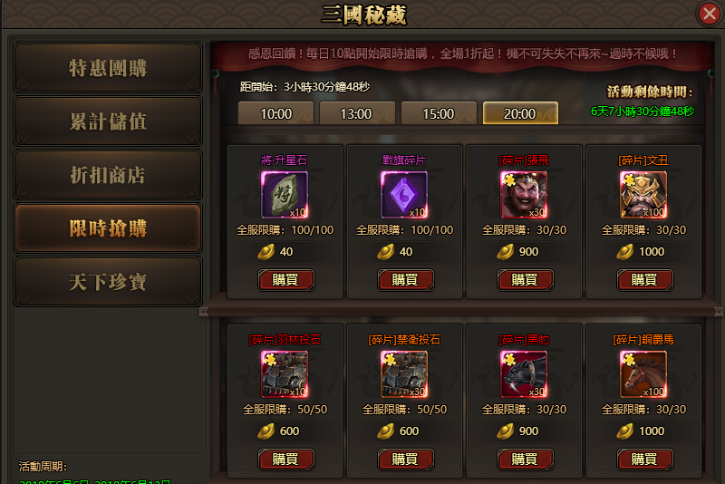 《三國霸者》感恩回饋,每日十點開啟限時搶購,全天四個時間段,全場一折起!機不可失失不再來!