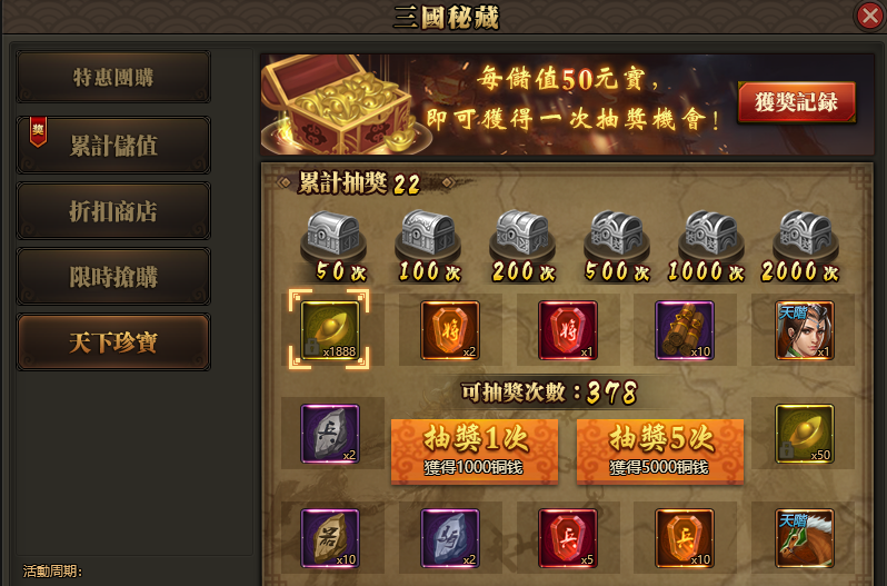 活動時間內,每儲值50元寶,即可抽獎一次,1888綁金,無雙神將馬雲祿等你來贏!累計抽獎次數達到一定數量更可獲得超級寶箱!