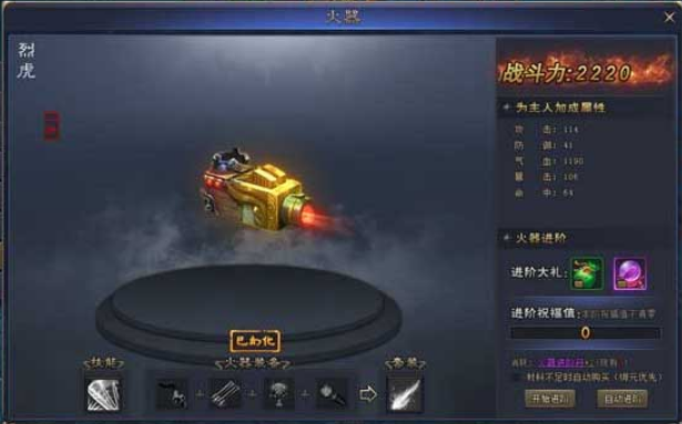 火器是遊戲中機甲的武器;遊戲中的角色火器共 12 階,進階獲得戰鬥屬性加成,成功進階啟動更酷炫火器外觀形象,火器裝備:火器一共可穿戴 4 件裝備,每件裝備分為 12 階,階數越高屬性越好,參加狂暴妖王、跨服妖王和進階副本可獲得火器裝備。