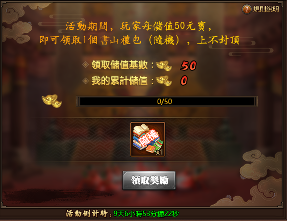 活動期間,每儲值50元寶,即可領取1個書山禮包,上不封頂。