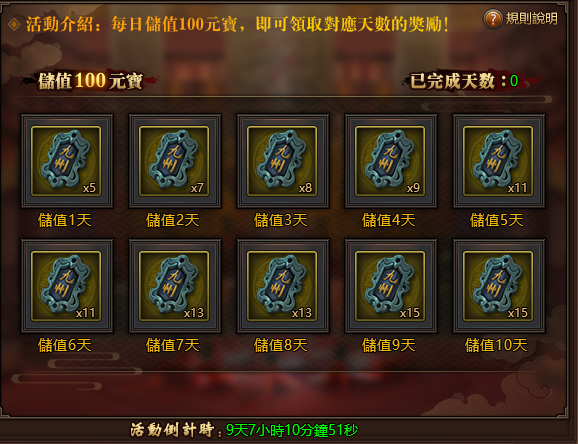 每日儲值100元寶,即可領取對應天數的獎勵。