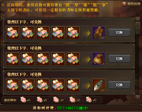 活動期間,參與活動可獲得帶有“開”、“學”、“那”、“點”、“事”五種字樣的書山,可使用一定數量的書山可兌換獎勵。