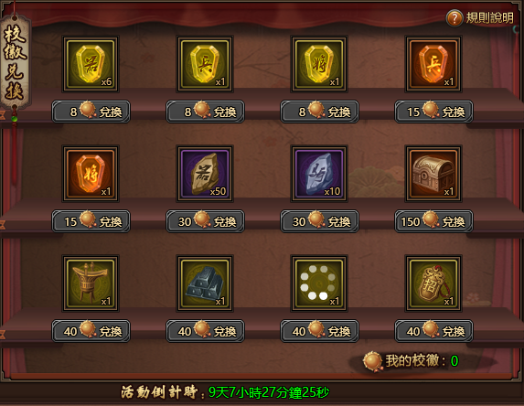 可用校徽兌換相應道具,校徽可通過每日登入、遊戲功勛、每日必做、擊殺遠征軍、土匪事件獲得。