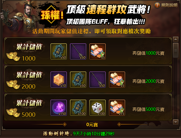 活動期間玩家儲值達標,可領取對應檔次的獎勵,神級武將孫權等你來拿!