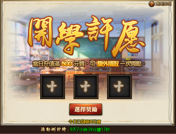 活動期間,每日登入遊戲可參與許願活動。每天可選擇三種道具放入許願池,當天即可領取。每日儲值金額達到500元寶,可額外許願一次!