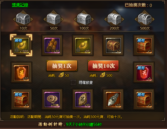活動期間,每消耗50元寶,可抽獎一次。